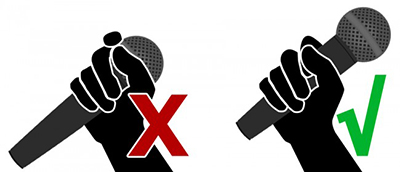 Ilekroć dźwiękowiec widzi bezsensowne oddalanie, czy nakierowanie mikrofonu na klatkę piersiową, to za każdym razem przeżywa stres. A przecież posługiwanie się mikrofonem nie wymaga jakiejś wybitnej wiedzy technicznej – wystarczy skierować go na swoje usta. Gdyby mikrofon był latarką, to powinien wówczas oświetlać Twój uśmiech. Kierowanie mikrofonu gdziekolwiek indziej powoduje zbieranie dźwięków z otoczenia, jak również zwiększa szanse na powstanie sprzężenia. Nie ma również najmniejszego powodu do zbytniego oddalania mikrofonu od ust przy głośniejszych partiach. Ruchy kilkucentymetrowe są zupełnie wystarczające, natomiast większe powodują słyszalne zaniki głośności, jak również zmieniają brzmienie wokalu.